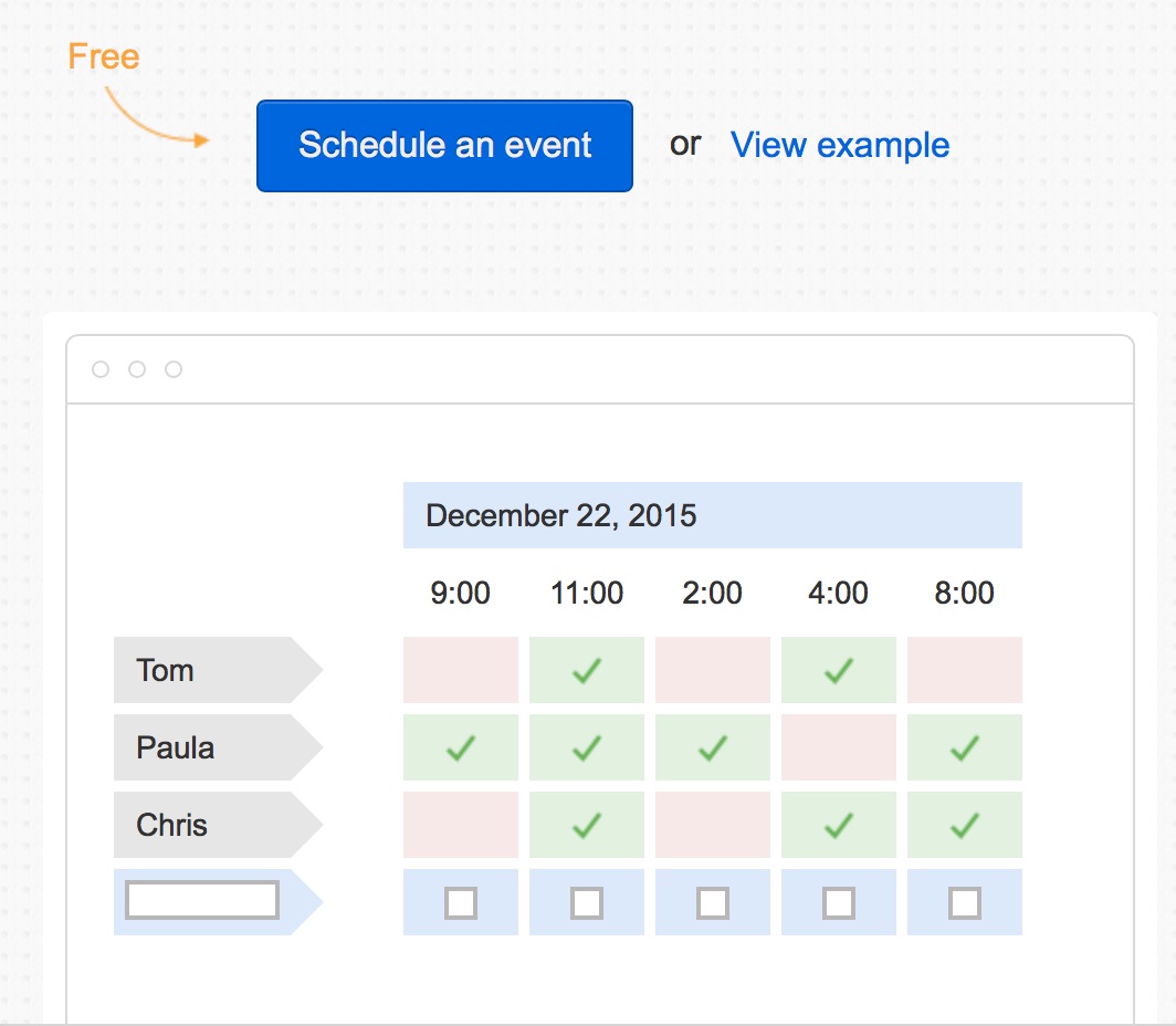 Avec Doodle, vous indiquez deux, trois ou plusieurs possibilités de RDV et vous envoyez des invitations à tout le monde. Chaque personne cochera les RDV pour lesquelles elle sera disponible. Dans Doodle (voir image ci-dessous) vous verrez ensuite à quelle date tout le monde sera disponible et vous confirmez cette date à tout le monde.